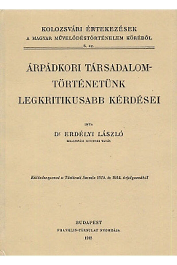 Az eredetileg 1915-ben megjelent tanulmány a kora Árpád-kori társadalom egészét kívánja rendszerbe foglalni. Szerzője az az Erdélyi László, akit többek között szenvedélyes vitázóként tart számon a magyar történetírás. Legemlékezetesebb tudományos pengeváltásainak tárgya a magyar állam középkori történelmének első szakasza, különösen a jellegzetes középkori társadalmi csoportok kialakulásának kérdése volt. Ebbe a híres vitába pillanthat bele az, aki kézbe veszi a jelen kötetet. Az először a Történelmi Szemle hasábjain megjelent tanulmánysorozatból összeállított kötetben lényegében korábbi munkáiban kifejtett nézeteit hangoztatja újra, további okleveles adatokkal megerősítve, valamint a többek között Tagányi Károly, Hóman Bálint és Eckhart Ferenc által kifejtett ellenérveket cáfolva, vitatva. Gondolatainak központi tétele, hogy a korabeli magyar társadalmat csak két alapvető osztályra, szabadokra és szolgákra osztja fel, szemben az összetettebb elképzelésekkel.